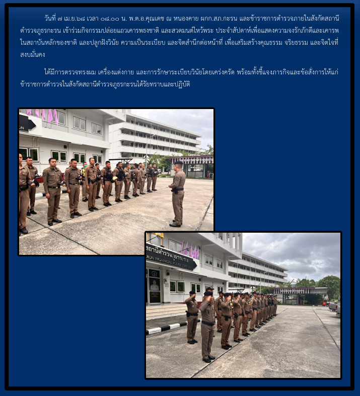 วันที่ 7เม.ย.68 เวลา 08.00 น. พ.ต.อ.คุณเดช ณ หนองคาย ผกก.สภ.กะรน และข้าราชการตำรวจภายในสังกัดสถานี