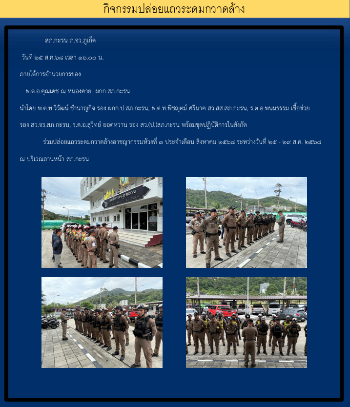 ปล่อยแถวระดมกวาดล้างอาชญากรรมห้วงที่ 3 ประจำเดือน สิงหาคม 2568 ระหว่างวันที่ 25- 29 ส.ค. 2568 ณ บริเวณลานหน้า สภ.กะรน