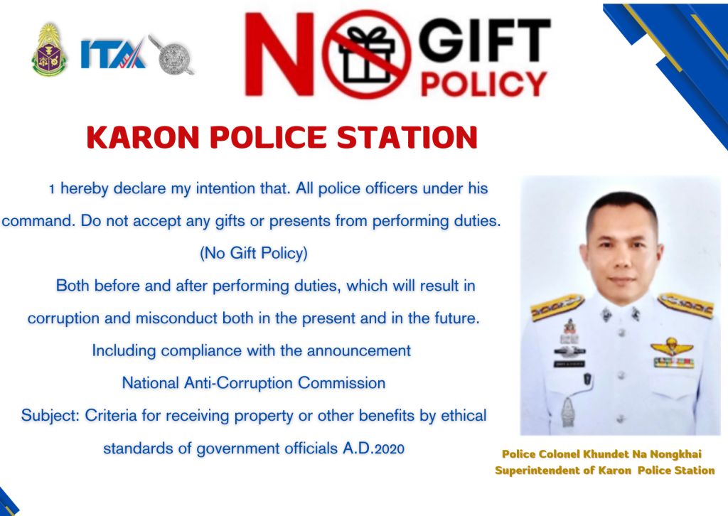 พ.ต.อ.คุณเดช ณ หนองคาย ผกก.สภ.กะรน ได้ประชุมชี้แจง และประกาศนโยบายมาตรการป้องกันการรับสินบน